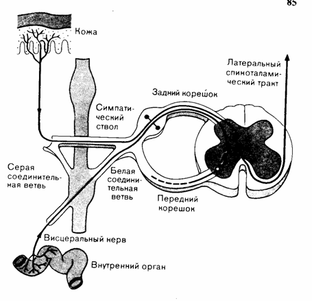 Некоторые болевые афференты, которые идут от кожи и внутренних органов и входят в данный сегмент спинного мозга, связаны с одними и теми же нейронами, служащими началом спиноталамического тракта. Возбуждение таких клеток интерпретируется как периферическая боль, потому что такая интерпретация соответствует приобретенному опыту. При заболевании внутреннего органа часто возникает еще одно следствие конвергенции ноцицептивных афферентов от этого органа и от соответствующего дерматома на нейронах проводящего боль пути, а именно гиперестезия (повышенная чувствительность) кожи данного дерматома. Это происходит потому, что возбудимость спинальных вставочных нейронов повышается висцеральными импульсами, и таким образом стимуляция кожи вызывает в центрах более сильную активность по сравнению с нормой (облегчение).