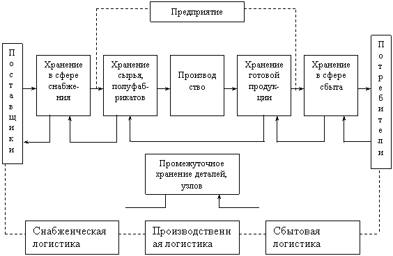 Логистика является системой, содержащей функциональные области. Между областями логистики существуют связь и взаимозависимость. Например, если в основном производстве используется технология, не требующая наличия существенных промежуточных запасов материалов и сырья, то в соответствии с логистикой поставки предусматривается осуществлять в строго определенное время через короткие интервалы. Для выполнения нерегулярных заказов в минимальные сроки, когда для основного производства характерно пространственное сосредоточение оборудования, создание резервов производственных мощностей (так называемых систем «островов производства»), в области закупок используются соответствующие способы, позволяющие приобрести разнообразные материальные ресурсы, с тем, чтобы выполнить индивидуальные заказы. В логистиеской цепи, т. е. цепи, по которой проходят товарный и информационный потоки от поставщика до потребителя, выделяются следующие главные звенья (рис.1):