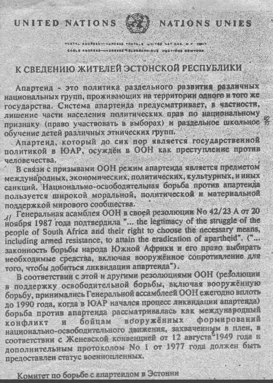 В Конституции Эстонской Республики принятой в 1992 году, в статье 3. мы находим обнадёживающий тезис: «Общепризнанные принципы и нормы международного права являются неотъемлемой частью правовой системы Эстонии». На словах Эстонская Республика широко поддержала Всеобщую Конвенцию по правам человека, однако в 1994 году имел место любопытный факт, когда общественность была взбудоражена листовкой, гулявшей по почтовым ящикам, подписанной неким Комитетом по борьбе с апартеидом в Эстонии. (См. выше.)