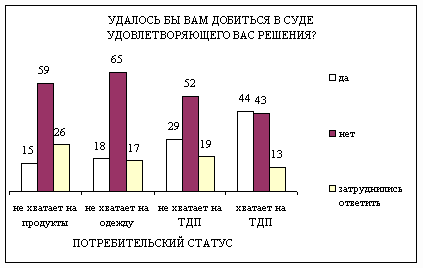 Чаще верит в это молодежь до 30 лет (29%), гораздо реже – лучше знающие нынешнюю жизнь лица среднего возраста 30-49 лет (17%), еще реже – пожилые люди 50 лет и старше(14%). Особенно важным для восстановления справедливости через суд представляется наличие достаточных материальных средств у жалобщика. Среди материально обеспеченных россиян 44% надеются, при необходимости, добиться в суде удовлетворяющего их решения; среди бедняков - только 15%.