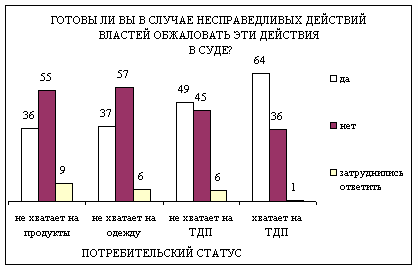 Если к результатам этого опроса можно относиться с недоверием, то опрос ВЦИОМ ( (http://www.wciom.ru/ ) 21-25 марта 2003 года, в котором учавствовало 1600 человек от 18 лет и старше, показал, что есть много причин для того, чтобы не обжаловать несправедливые действия властей в суде. Некоторым россиянам это просто не приходит в голову (6%), некоторые не знают, как это сделать (8%), для кого-то не по нутру сама судебная волокита (10%). Это психологические причины. Встречаются и опасения преследований со стороны власти, обоснованный или необоснованный страх сделать себе еще хуже (6%). Чаще всего, однако же, причина видится в пристрастности самого суда, заведомой безрезультатности обжалования (46%). Только один из четырех россиян (23%) верит, что при обжаловании в суде несправедливых действий властей удастся восстановить справедливость.
