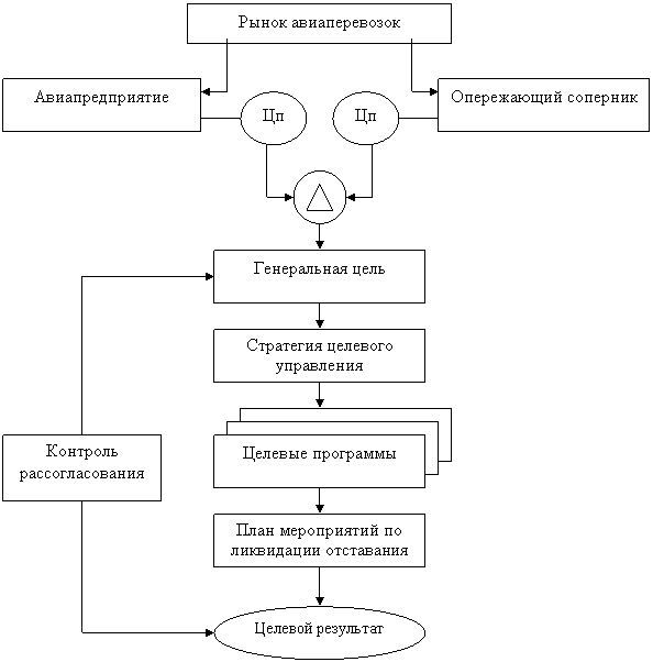При таком подходе выбранная система базовых показателей опережающих соперников становится тем нормативом, той долгосрочной целью, на достижение которой направлена генеральная стратегия авиапредприятия. Целевое управление предполагает поэтапную ликвидацию отставания и взаимную увязку долгосрочной и краткосрочных целей предприятия. Ежегодные целевые показатели устанавливаются вколичественном виде. Их величина зависит от результатов деятельности авиапредприятия,достигнутых за предшествующий год. Значения краткосрочных целевых показателей тесно увязываются с ежегодными планами работ по целевым программам.