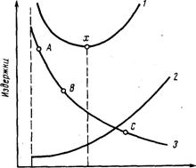 На рисунке приведен в качестве примера метод "чартов" при выборе средства транспорта. Транспорт А обеспечивает самые короткие сроки доставки, но характеризуется наиболее высокими издержками для отправителя, тогда как вид транспорта В дает меньшие затраты, однако увеличивается продолжительность доставки. Вид транспорта С дает минимальные затраты на перевозку, но наибольшую продолжительность доставки, чем увеличиваются потери от упущенной выгоды от нереализованных сделок. С учетом этих факторов наиболее подходящий вид транспорта определяется точкой х на "чарте", в которой общая величина издержек перевозки и потерь от нереализованных сделок является минимальной.
