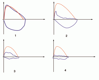 Рис. Различные формы кривых поток-объем (пунктир — условно «идеальная» кривая): 1 — здоровый субъект; 2 — бронхиальная астма; 3 — патология гортани (голосовых связок); 4 — опухоль трахеи