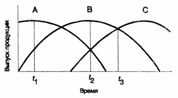 Рис. 1. Циклы выпуска сменяющих друг друга продуктов (А, В, С)