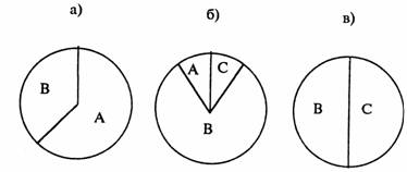 Рис. 2. Диаграммы структуры выпуска продукции фирмы в различные моменты времени: а) момент t1; б) момент t2; в) момент t3.