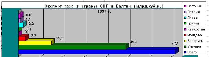 Объём поставки природного газа в Ближнее Зарубежье в 1997 г. сохранился на уровне 1996 г. и составил 72,1 млрд.м3. Однако по некоторым странам наметился рост потребления российского газа: Беларусь - на 11,7%, Молдова - на 3,1%.