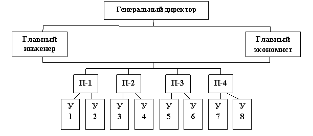 Появление линейно – функциональных структур обусловлено стремлением избежать недостатков, присущих линейным и функциональным структурам. Лине йно – функциональная структура управления получила наибольшее распространение в управлении машиностроительными предприятиями и состоит в том, что линейные руководители осуществляют свою деятельность на принципах единоноличия, но для обеспечения необходимой компетентности управленческих решений при руководстве создаются функциональные подразделения, которые возглавляют ведущие специалисты в определённых областях. Преимуществом такой структуры является повышение качества принимаемых решений и соблюдение принципа единоналичия, а недостатки – в тенденции к увеличению штатов функциональных служб, к их отрыву от проблем, наиболее важных для исполнителей. Ниже приведена схема линейно – функциональной структуры управления.