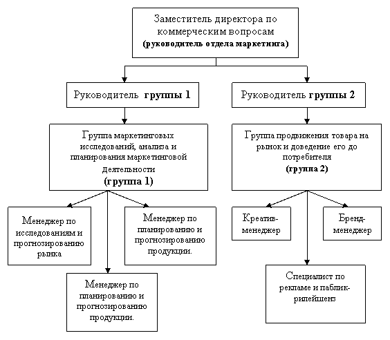 В основу организационной структуры управления отделом маркетинга положен товарно-функциональный принцип. Сам отдел наряду с отделом сбыта и снабжения подчиняется заместителю директора по коммерческим вопросам. Ниже приведена структура отдела: