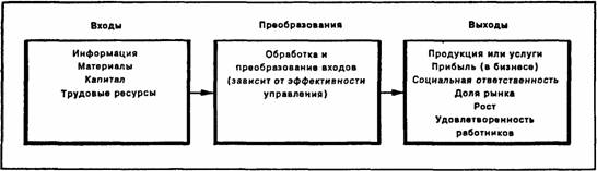 МОДЕЛЬ ОРГАНИЗАЦИИ КАК ОТКРЫТОЙ СИСТЕМЫ. Рис. 2.3. представляет собой упрощенное изображение организации как открытой системы. На входе организация получает от окружающей среды информацию, капитал, человеческие ресурсы и материалы. Эти компоненты называются входами. В процессе преобразования организация обрабатывает эти входы, преобразуя их в продукциюили услуги. Эта продукция и услуги являются выходами организации, которые она выносит в окружающую среду. Если организация управления эффективна, то в ходе процесса преобразования образуется добавочная стоимость входов. В результате появляются многие возможные дополнительные выходы, такие как прибыль, увеличение доли рынка, увеличение объема продаж (в бизнесе), реализация социальной ответственности, удовлетворение работников, рост организации и т.п.