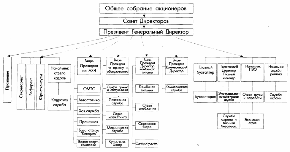 Текущее управление гостиничным комплексом осуществляется Президентом (см. схему 3) и аппаратом его заместителей в ранге вице-президентов, которым в свою очередь подчинены подразделения, возглавляемые руководителями среднего звена.