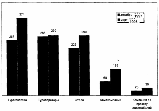 К марту 1998 года уже 290 гостиниц и гостиничных цепочек открыли свои информационные узлы в Internet. По мнению Брайена Лэнгтона/ президента гостиничной сети Holiday Inn, разместившей подробные сведения о своих отелях в Internet/ новая технология уже продемонстрировала свои преимущества. За короткое время более 70 тысяч пользователей Internet обратились за информацией в раздел Holiday Inn.