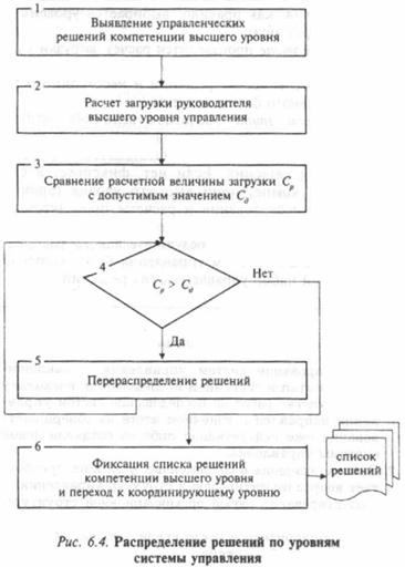 На третьем этапе расчетная величина загрузки сравнивается с допустимым значением и, если эта величина больше допустимой, осуществляется этап перераспределения решений. Если нет, фиксируется список решений компетенции высшего уровня (блок 6). Аналогичные исследования и расчеты проводятся для всех уровней, количество которых регламентировано выбранной структурой, В результате такого распределения за каждым уровнем управления будет закреплен определенный набор управленческих решений.