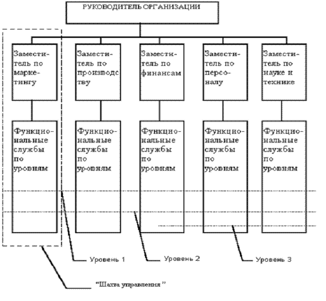 Основы линейных структур составляет так называемый "шахтный" принцип построения и специализация управленческого процесса по функциональным подсистемам организации (маркетинг, производство, исследования и разработки, финансы, персонал и т. д. ). По каждой подсистеме формируется иерархия служб ("шахта"), пронизывающая всю организацию сверху донизу (см. рис. 1.3.). Результаты работы каждой службы оцениваются показателями, характеризующими выполнение ими своих целей и задач. Соответственно строится и система мотивации и поощрения работников. При этом конечный результат (эффективность и качество работы организации в целом) становится как бы второстепенным, так как считается, что все службы в той или иной мере работают на его получение.