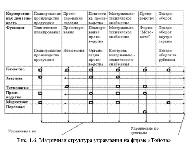 Такая структура представляет собой сетевую структуру, построенную на принципе двойного подчинения исполнителей: с одной стороны - непосредственному руководителю функциональной службы, которая предоставляет персонал и техническую помощь руководителю проекта, с другой - руководителю проекта или целевой программы, который наделен необходимыми полномочиями для осуществления процесса управления. При такой организации руководитель проекта взаимодействует с 2-мя группами подчиненных: с постоянными членами проектной группы и с другими работниками функциональных отделов, которые подчиняются ему временно и по ограниченному кругу вопросов. При этом сохраняется их подчинение непосредственным руководителям подразделений, отделов, служб. Для деятельности, которая имеет четко выраженное начало и окончание, формируют проекты, для постоянной деятельности - целевые программы. В организации и проекты, и целевые программы могут сосуществовать. Пример матричной программно - целевой структуры управления (фирма "Тойота") приведен на рис. 1.8. Эта структура была предложена Каори Ишикава в 70-х годах и с небольшими изменениями функционирует по сей день не только на фирме "Тойота", но и на многих других фирмах по всему миру.