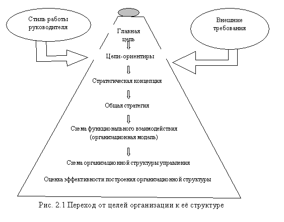 Выполнение всех этапов организационного проектирования должно сопровождаться экономическим анализом, учитывающим как ресурсные возможности организации, так и потребности внешней среды. Поскольку проектирование организации определяет её будущее и последовательность её развития, все этапы проектирования предусматривают проведение вычислительных экспериментов с использованием процедур моделирования. В частности, цель, определяемая на первом этапе проектирования, - это исходная модель будущего состояния организации. Другие элементы модели организации могут быть представлены в виде развёрнутого алгоритма. Отражающего последовательность действий на этапах организационного проектирования (см. рис. 2.2).