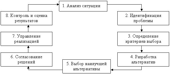 Процесс принятия решений — это циклическая последовательность действий субъекта управления, направленных на разрешение проблем организации и заключающихся в анализе ситуации, генерации альтернатив, принятии решения и организации его выполнения.