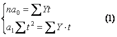 Параметры уравнения прямой линии а0 и а1 в соответствии с МНК определяется решением следующей уравнений (1) с помощью специальной вспомогательной таблицы.