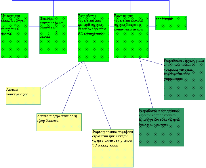 Стратегическое управление концерном предполагает применение принципов управления однородной сферой бизнеса плюс управление стратегическими соответствиями с привлечением элементов портфельного менеджмента. Основные этапы стратегического управления концерном представлены на рис 4.1.