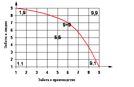 · забота о людях (ось Y) – стремление руководителя к достижению конечных результатов на основе доверия и уважения работников, симпатии друг к другу, понимания и поддержки. Это создание благоприятных условий труда, ходатайство о повышении зарплаты, премирование и т.п