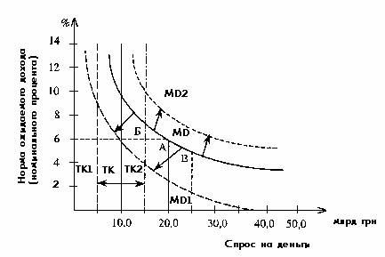 По вертикали системы координат отображена норма (в %) ожидаемого дохода на альтернативные деньгам активы, включая норму депозитного процента. Изменение этой нормы означает изменение альтернативной стоимости сохранения денег в форме, которая не приносит дохода. По горизонтали отображен объем спроса на деньги в млрд грн. Совокупность кривых МD, МD1, МD2 отображает функциональное изменение спроса на деньги в зависимости от двух групп факторов: изменения номинального объема ВHП и изменения нормы ожидаемого дохода (то есть альтернативной стоимости сохранения денег). Кривые ТК, ТК1 и ТК2 отображают изменение текущей кассы.