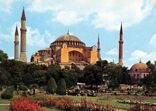 Вершиной развития арочно-сводчатых структур явилась грандиозная купольная базилика собора Софии в Константинополе построенная греческими архитекторами Анфимием из Тралл и Исидо-ром из Милета в 532—537 гг., в правление императора Юстиниана.