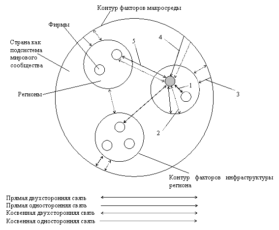 На рис 1 показаны прямые или косвенные связи между фирмами внутри региона (1), влияние факторов инфраструктуры региона на устойчивость и эффективность фирмы (2), факторов макросреды на эффективность и качество работы региона (3), факторов макросреды на устойчивость и эффективность работы фирмы (4) и факторов взаимодействия фирм разных регионов по различным вопросам (6). Односторонняя прямая связь между контуром факторов макросреды и инфраструктуры региона (3) означает законодательное и налоговое воздействие федеральных органов управления страны на регион, косвенная двухсторонняя связь между этими контурами означает взаимное влияние по другим факторам (см.таблицу 1).