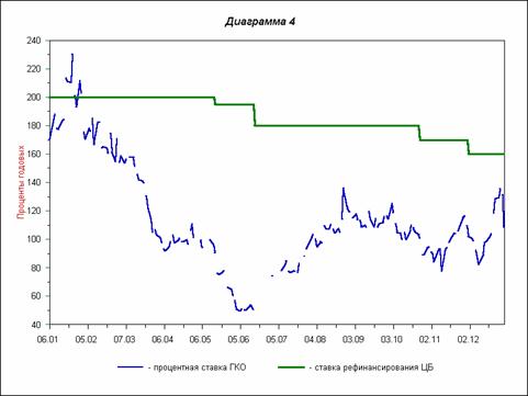 Во-вторых, ЦБ, которые действительно заинтересованы в том, чтобы уровень процентной ставки имел какое-либо регулирующее значение для банковской системы, ориентируются при его установлении на рынок. Причем величина разницы между официальной и рыночной ставками поддерживается на минимальном уровне[16]. Те ЦБ, для которых величина процентной ставки служит лишь "бумажным" ориентиром, за которым нет никаких регулятивных (а тем более стимулирующих) действий, устанавливают ее "с потолка" на уровне, не имеющем никакого отношения к реальности. В качестве графического примера на диаграмме 4 изображена динамика ставки рефинансирования Банка России и процентной ставки на рынке ГКО в 1995 году.