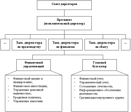 Организационная структура системы управления финансами хозяйствующего субъекта, а также ее кадровый состав могут быть построены различными способами в зависимости от размеров предприятия и вида его деятельности. Для крупной компании наиболее характерно обособление специальной службы, руководимой вице-президентом по финансам (финансовым директором) и, как правило, включающей бухгалтерию и финансовый отдел. На небольших предприятиях роль финансового менеджера обычно выполняет главный бухгалтер.