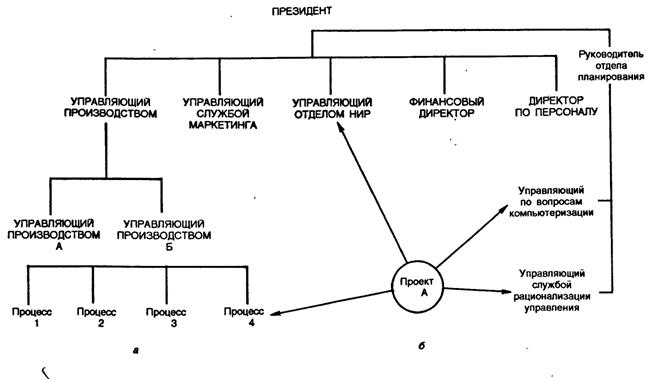 Проектная структура — это временная организация, создаваемая для решения конкретной задачи. Она образуется внутри функционального подразделения (рис.4б). Ее членами являются высококвалифицированные специалисты различных областей, собранные вместе для осуществления определенного проекта. Когда проект завершен, группа распускается: одна часть специалистов уходит на свои прежние места, другая часть переходит в новую проектную команду. Особенность этой структуры заключается в том, что сотрудники подчиняются одновременно двум руководителям - руководителю проекта и руководителю отдела, в рамках которого эта группа работает. Многие предпринимательские фирмы создают такие структуры, чтобы сконцентрировать внимание и усилие на разработке особо важных новых технологий, продуктов, т.е. на инновациях.