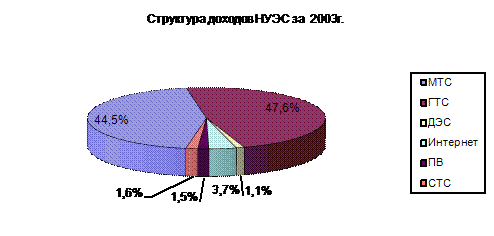 Новокузнецкий узел электросвязи – оператор, предоставляющий телекоммуникационные услуги на территории города Новокузнецка, Новокузнецкого района и юга Кузбасса. 40 операторов в городе имеют лицензии на предоставления телекоммуникационных услуг, это значит, что конкурентов у предприятия предостаточно. Особенно активно за последние 3-4 года создают современные сетевые структуры, позволяющие предоставлять широкий спектр услуг электросвязи, такие операторы как ОАО «Кузбассэнергосвязь», ЗАО «Кузбасская сотовая связь» – «Сотел», ЗАО «Кемеровская мобильная связь» – «Билайн», ОАО «Кузбассвязьуголь», ЗАО «Кузнецкая коммерческая телефонная сеть», ЗАО «Связь - сервис». Основные конкуренты осваивают наиболее прибыльный бизнес и не связаны с дотацией и содержанием нерентабельных сетевых структур, таких как доставка телеграмм, сельская телефонная связь, проводное звуковое вещание, мобилизационные задания. Тарифы на основные услуги, регулируемых МАП РФ, для ОАО «Электросвязь» устанавливают гораздо ниже их себестоимости, конкуренты тарифы устанавливают самостоятельно. Конкуренты не имеют проблем льготной категории граждан, проблем неплатежей за предоставленные услуги бюджетной сфере и силовым структурам. На сегментах традиционных услуг связи НУЭС – это бесспорный лидер. По данным за прошлый год предприятие обслуживало: 90,2% рынка местной телефонной связи, 98,9% - сельской, 95,6% - междугородной и 98,5% - международной связи, 53% - Интернет услуги, 100% - телеграфной связи. Предприятие позиционируется как многопрофильная компания, услуги которой, рассчитаны на любого клиента. На рисунке 9 представлена структура доходов НУЭС за 2003 год.
