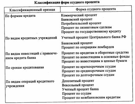 Существуют различные формы ссудного процента, их классификация определяется рядом признаков, в том числе: