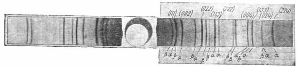 После указанных выше операций промера и расшифровки рентгенограммы переходим непосредственно к вычислению периода решетки. Проведем в качестве образца подобный расчет на примере некоторых линий рентгенограммы.