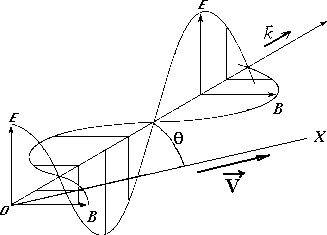 Выясним закон преобразования частоты и волнового вектора при переходе в другую инерциальную систему отсчета. Будем для определенности считать, что волна распространяется под углом к оси 0x, вдоль которой со скоростью V движется "штрихованная" система отсчета S. Из Рис. 11 видно, что существуют пространственно - временные точки, в которых векторы поля обращаются в нуль (узловые точки волны - те точки, в которых косинус равен нулю). Ясно, что это свойство поля носит объективный характер и должно выполняться во всех инерциальных системах отсчета. Отсюда следует, что фаза электромагнитной волны должна быть инвариантна!