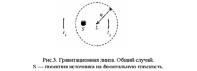 Если, однако, гравитационная линза не лежит на прямой, соединяющей источник с наблюдателем, картина оказывается иной. В случае сферически-симметричной линзы возникают два изображения (рис. 3), одно из которых лежит внутри кольца Эйнштейна, соответствующего осесимметричной картине, а другое — снаружи. Подобные изображения также наблюдались, они выглядят как двойные квазары, как квазары-близнецы.