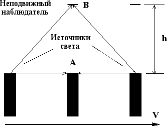 Мысленные эксперименты с движущимися часами, аналогичные только что описанному, показывают, что здесь синхронизация невозможна и единого для всех инерциальных систем времени не существует. Расмотрим пример с "эйнштейновским поездом" (см. Рис. 5).