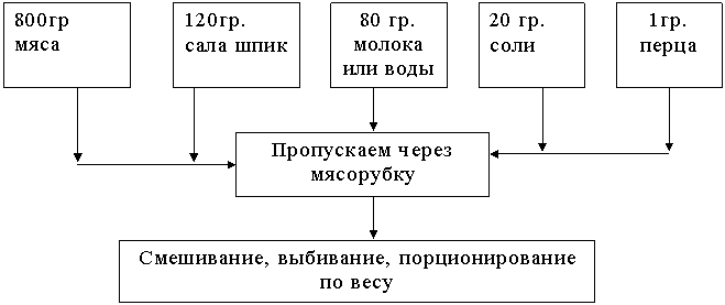 Для приготовления полуфабриката нарезанное на куски котлетное мясо говядины, баранины или свинины соединяют с жиром-сырцом, черствым пшеничным хлебом 1-го или высшего сорта, предварительно замоченным в молоке или воде, сырой репчатый лук, измельчают на мясорубке, добавляют воду (или молоко), соль, перец, перемешивают.