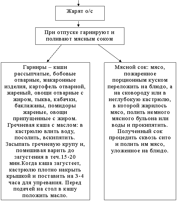 Гарниры – каши рассыпчатые, бобовые отварные, макаронные изделия отварные, картофель отварной, картофель жареный (из сырого), картофель жареный (из вареного), картофель жареный во фрютире, овощи отварные с жиром, помидоры жареные, тыква, кабачки, баклажаны жареные.