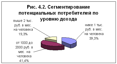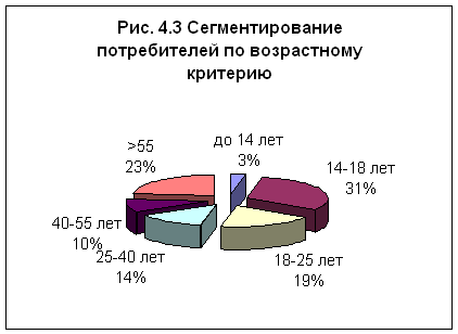 Для эффективной работы и успешного развития для нашей парикмахерской наиболее привлекательным является сегмент людей с доходом выше 2000 рублей в месяц на человека, т.е. потенциальное количество потребителей – 5400 человек. Но данную величину необходимо скорректировать на величину пожилых людей (>65 лет, 23%), не посещающих парикмахерскую (по данным проведенного маркетингового исследования, см. рис. 4.3).