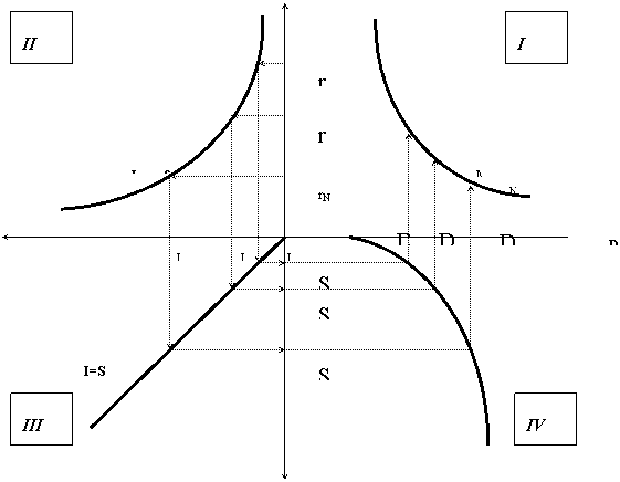 Равновесная ставка процента rE вызывает инвестиционный спрос IE (квадрант II). Для его полного удовлетворения нужно предложение сбережений в объеме SE (квадрант III), а такое предложение возможно только при личном располагаемом доходе DIE, что отражает точка равновесия Е (квадрант I).