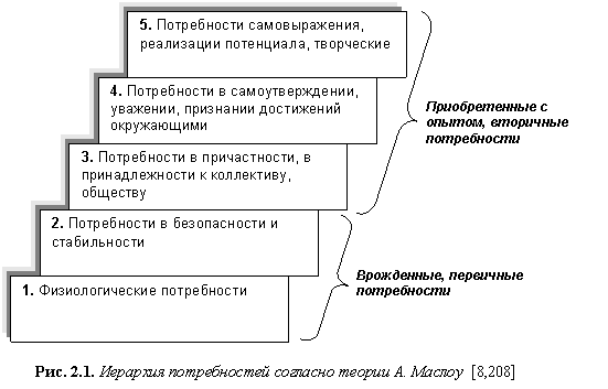 Группы потребностей находятся в иерархическом подчинении по отношению друг к другу («пирамида потребностей Маслоу», рис. 2.1.).
