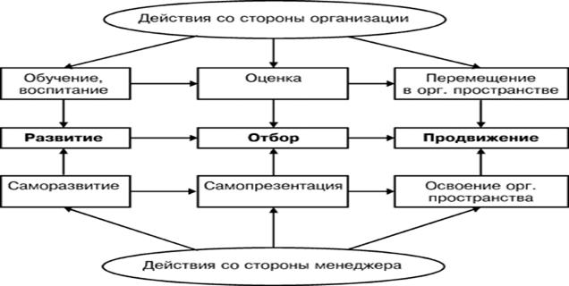 Таким образом, управление карьерой менеджера, карьерным процессом в целом представляет собой сложную, комплексную, многоаспектную деятельность. Принципиальная схема взаимодействия организации и сотрудника в процессе управления его карьерой представлена на рис. 7.