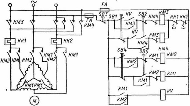 Помимо рассмотренных двухскоростных АД применяются также трех- и четырехскоростные АД. Первые из них помимо переключаемой обмотки статора, выполняемой аналогично рассмотренной выше, имеют также и одну непереключаемую обмотку. Четырехскоростные АД с различным числом пар полюсов р1, р2, p3, p4 позволяют получить четыре различные механические характеристики.