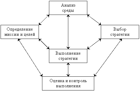 Стратегическое управление можно рассматривать как динамичен кую совокупность пяти взаимосвязанных управленческих процессов. Эти процессы логически вытекают (или следуют) один из другого. Однако существует устойчивая обратная связь и, соответственно обратное влияние каждого процесса на остальные и на всю их совокупность. Это является важной особенностью системы стратегического управления. Схематически структура стратегического управления изображена на рис. 1.