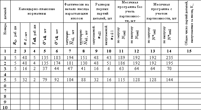 Расчет общего количества деталей, подлежащих запуску и выпуску за месяц (без учета партионности), удобно проводить с помощью табл. 11.