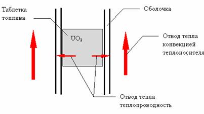 В результате деления, тепловая энергия выделяется в таблетке, которая нагревается. За счет теплопроводности тепловая энергия предается на оболочку. Теплоноситель омывая оболочку снимает тепловую энергию и нагревается, в РБМК теплоноситель частично испаряется.