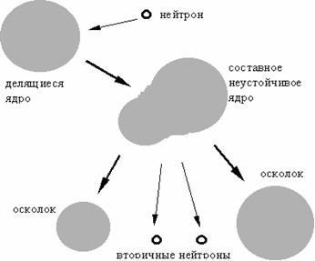 В принципе, если нейтрон обладает достаточно большой энергией, то разделится может любое ядро. В большинстве ядерных реакторов главным делящимся изотопом является изотоп урана 235U. При делении урана образуются два ядра-осколка и два или три нейтрона (в среднем около 2.5 нейтрона на один акт деления). При делении одного ядра выделяется приблизительно 3.15´ 10-13Дж энергии.