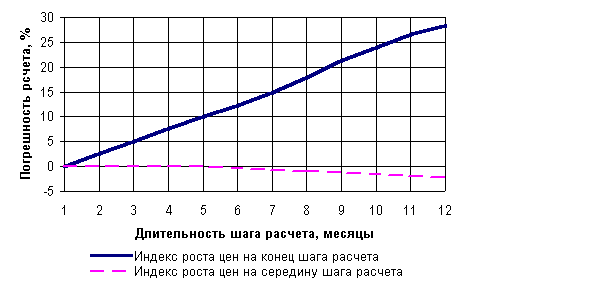 Отметим еще один положительный момент определения индекса роста цен на середину шага расчета. В “Методических рекомендациях по оценке эффективности инвестиционных проектов .” [2] справедливо отмечается важность учета инфляционного фактора при прогнозировании движения денежных потоков, так как он вносит существенные изменения в картину поступления и расходования денежных средств. Однако, рекомендуемое при этом к использованию значение индекса роста цен на конец шага расчета, в случае его большой длительности приводит к существенному завышению денежных потоков. Если при дисконтировании по алгоритмам [2] это нивелируется заниженным значением коэффициента дисконтирования (2) (рассчитываемым также на конец шага расчета), то на величину свободных денежных средств это сказывается напрямую и может исказить финансовый характер реализации проекта. На рис. 2 показаны значения погрешности расчета суммарных (нарастающим итогом) денежных потоков при переходе от помесячной схемы к поинтервальной при расчете индекса роста цен на конец и середину шага расчета при месячном уровне инфляции 5%.