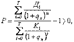 Если в данную формулу подставить исходную информацию рассмотренного в предыдущем параграфе примера, то при нормативе дисконтирования q н = 0,06 рентабельность инвестиций составит Р = 0,0804. Этот результат получается путем деления величины 5131,71 на величину 4749,99. Затем из частного от деления указанных величин вычитается единица и получается искомая рентабельность инвестиций — 0,0804.