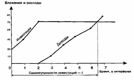 Как видно из рисунка, доходная составляющая проекта пересекает на графике ее инвестиционную составляющую ровно через 6,5 временных интервалов. Это и означает, что посредством доходов в результате эксплуатации проекта предприниматель вернет свои инвестиционные вложения именно в указанный срок.